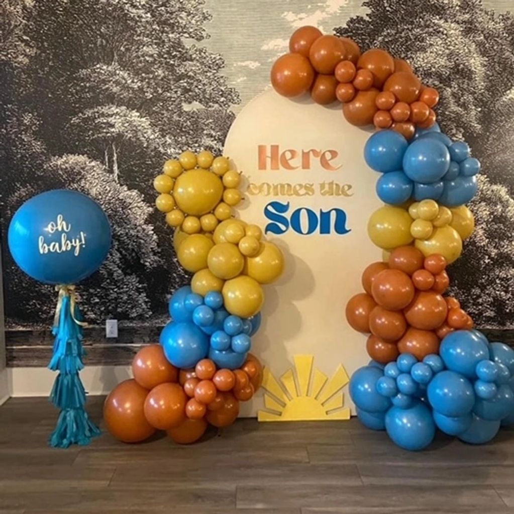 Here Comes the Sun Baby Shower. 18 Ft Balloon Garland Surrounding 6.6' Arch/Cover with Customer Letting, Jumbo Balloon and Wooden Sun