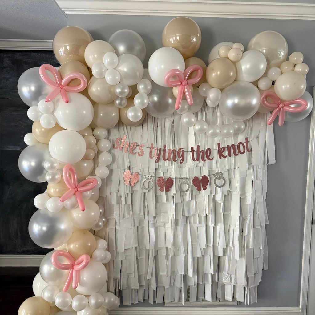14 Ft Balloon Garland With Pearl Necklaces, Bows, Layered Fringe Backdrop and Banner