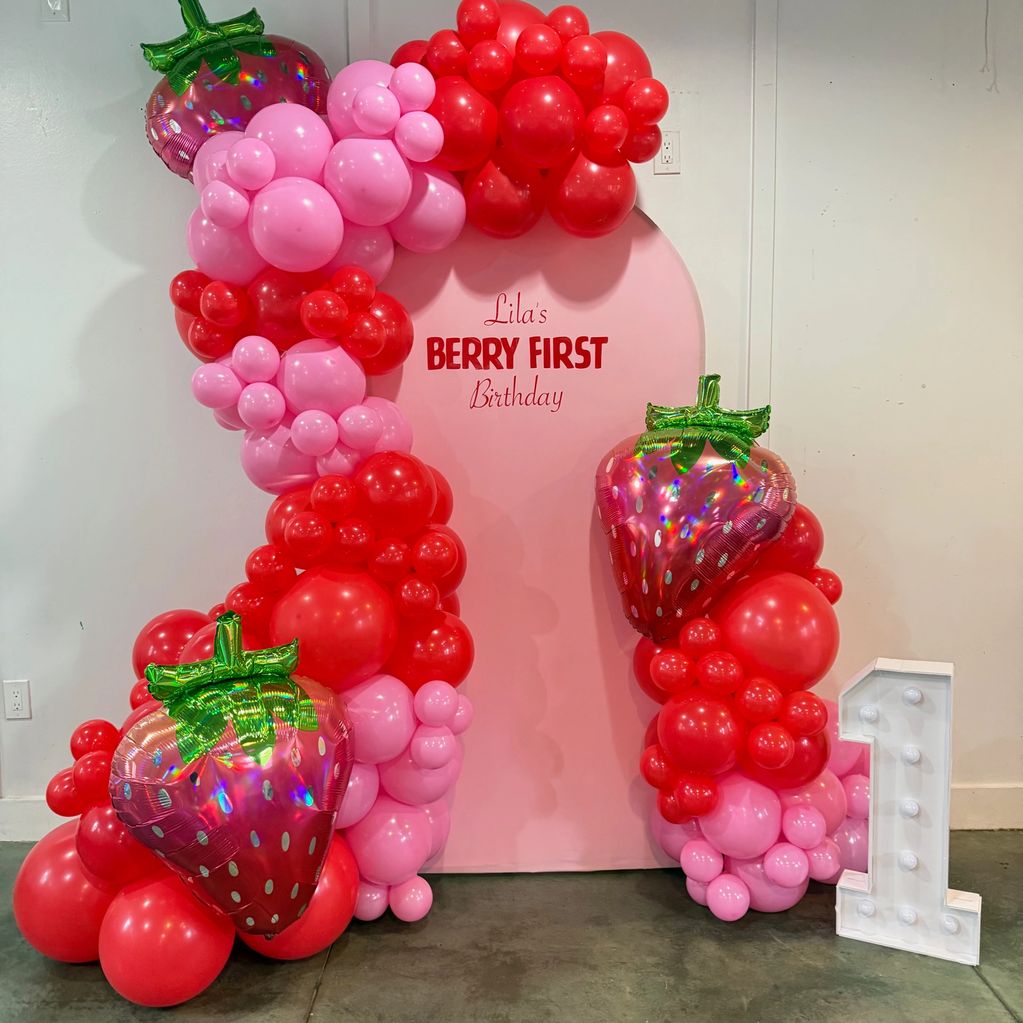 18 Ft Balloon Garland with Arch/Cover, Custom Lettering, #1 Light Up Marquee and Strawberry Foils
