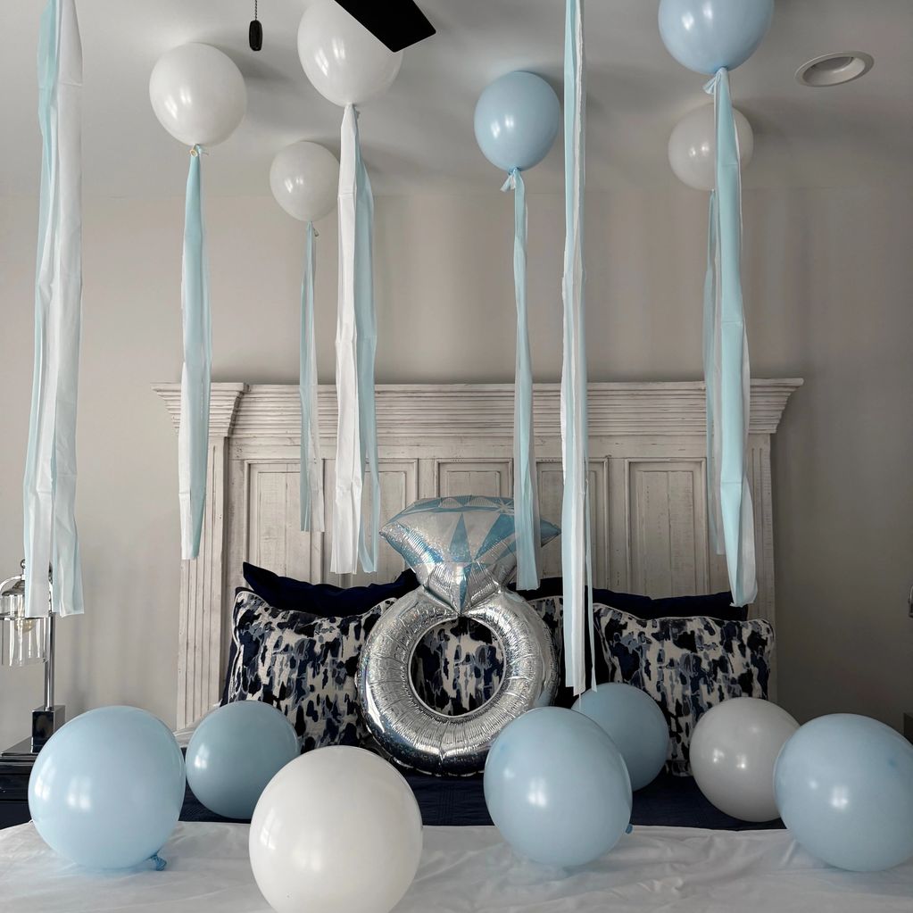 Ceiling Balloons with Streamers, Bed and Floor Balloons and a Ring or Birthday Foil Balloon. Great for bachelorette,/bridal suites, birthdays, proposals and more!
